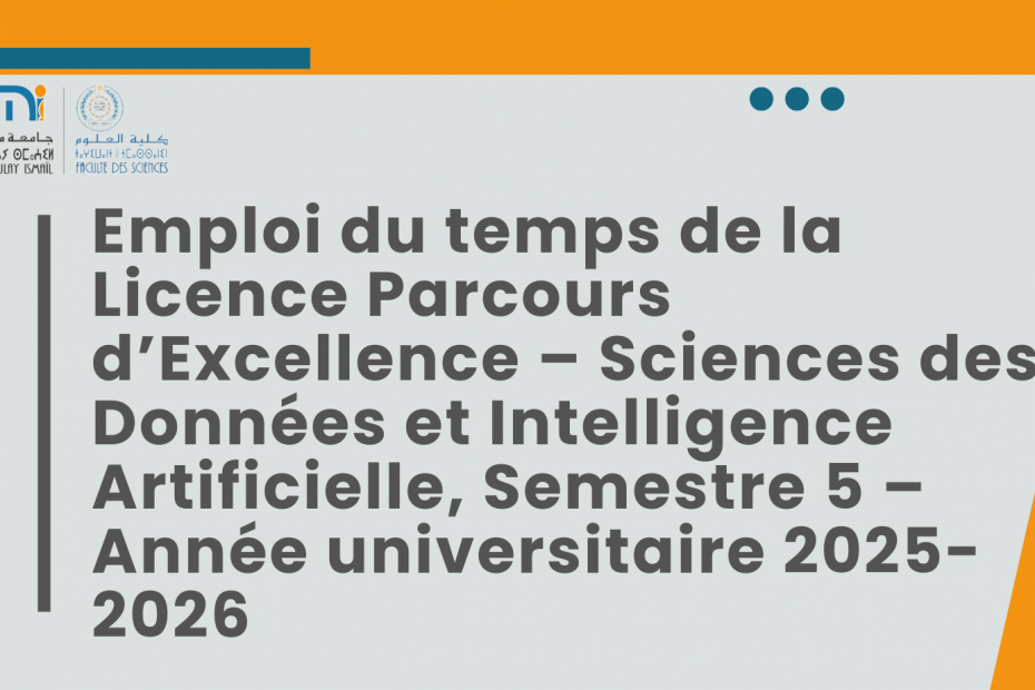 Avis important : Emploi du temps de la Licence Parcours d’Excellence – Sciences des Données et Intelligence Artificielle, Semestre 5 – Année universitaire 2025-20263 novembre 2025Actualité, Parcours d'Excellence