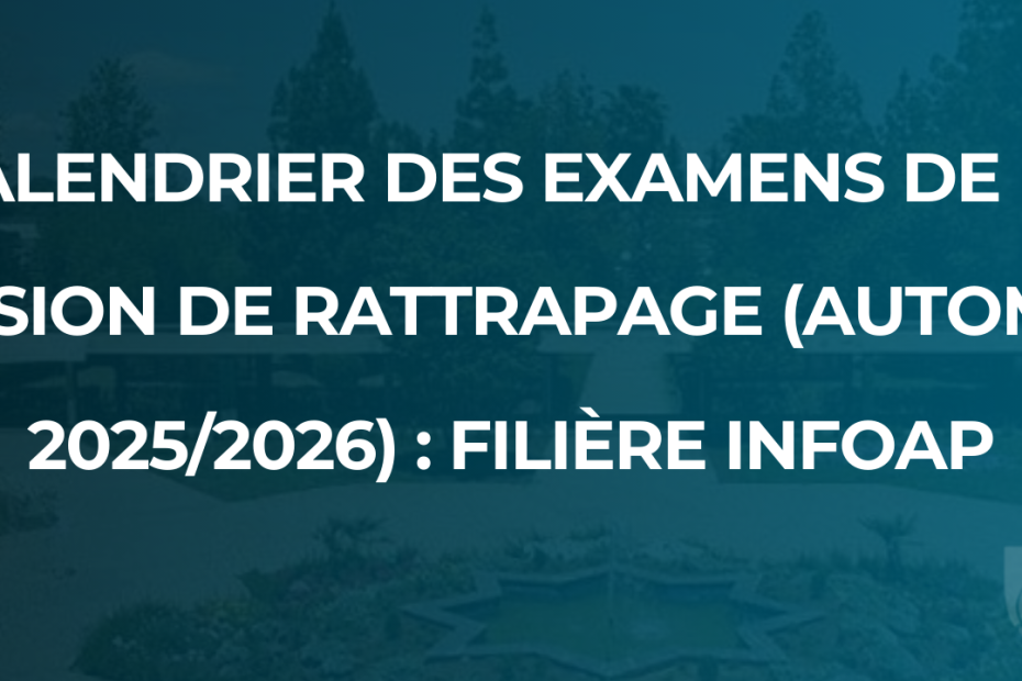 Les listes des étudiants inscrits aux examens de la session Automne / Rattrapage 2025-2026 sont désormais disponibles pour l’ensemble des filières. Vous pouvez les consulter via le lien suivant : https://drive.google.com/drive/folders/14d3ZV3yOHIrCvYK24bXNl4wtJKZY2Inm?usp=sharing