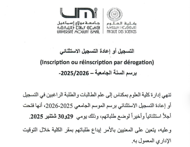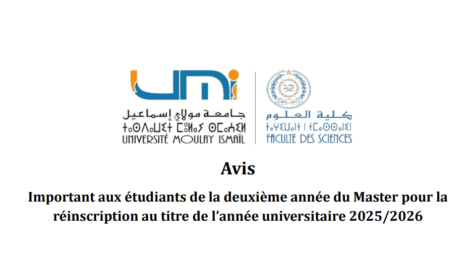 Le Doyen de la Faculté des Sciences de Meknès informe les étudiants du cycle Licence que le début des cours pour l’année universitaire 2025-2026 est prévu pour le lundi 29 septembre 2025. Les étudiants sont… Avis aux étudiants du cycle Licence