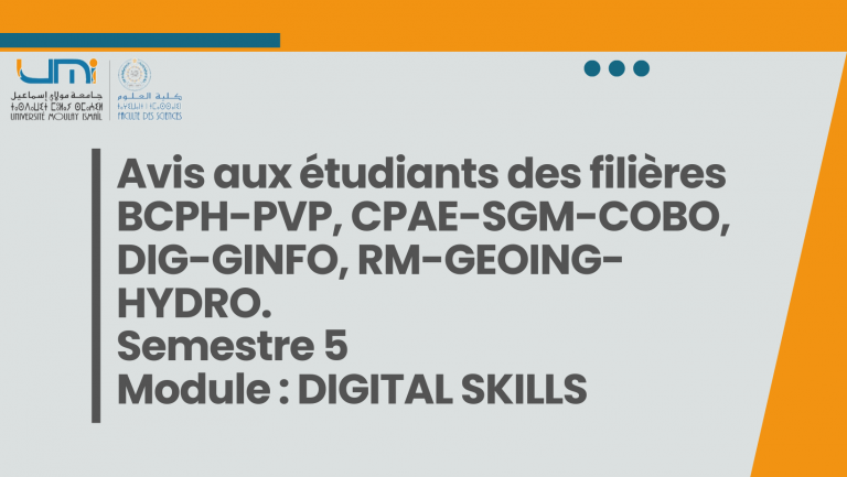 Avis aux étudiants des filières :BCPH-PVP, CPAE-SGM-COBO, DIG-GINFO, RM-GEOING-HYDRO. Semestre 5 Module : DIGITAL SKILLS