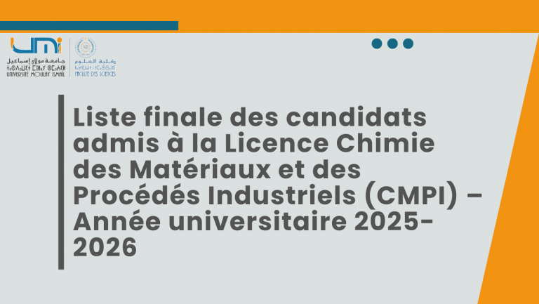 Avis :Liste finale des candidats admis à la Licence parcours d’excellence Chimie des Matériaux et des Procédés Industriels (CMPI) – Année universitaire 2025-2026