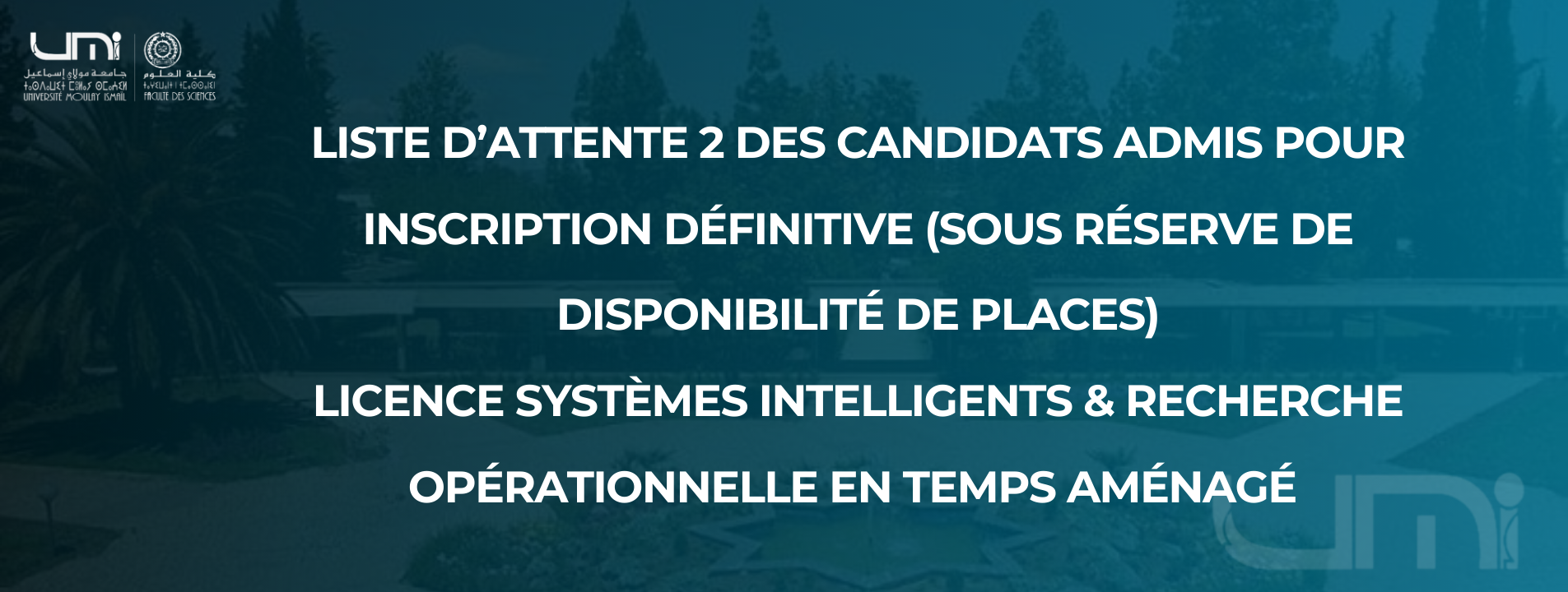Liste d’attente 2 des candidats admis pour inscription définitive (sous réserve de disponibilité de places) – Licence Systèmes Intelligents & Recherche Opérationnelle en Temps Aménagé