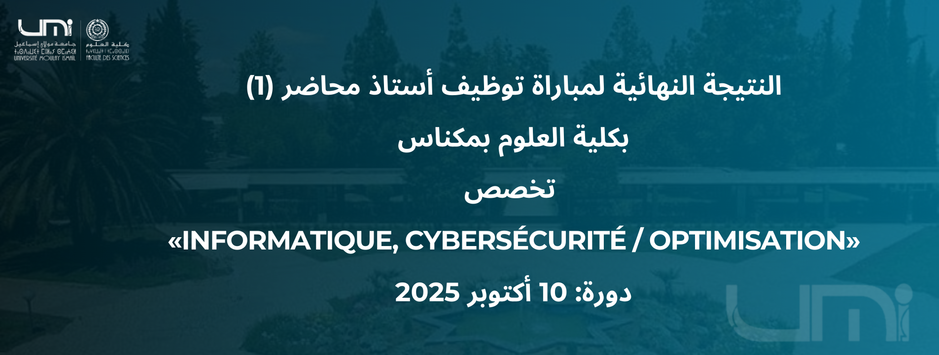 النتيجة النهائية لمباراة توظيف أستاذ محاضر (1) بكلية العلوم بمكناس تخصص: «Informatique, Cybersécurité / Optimisation» دورة: 10 أكتوبر 2025