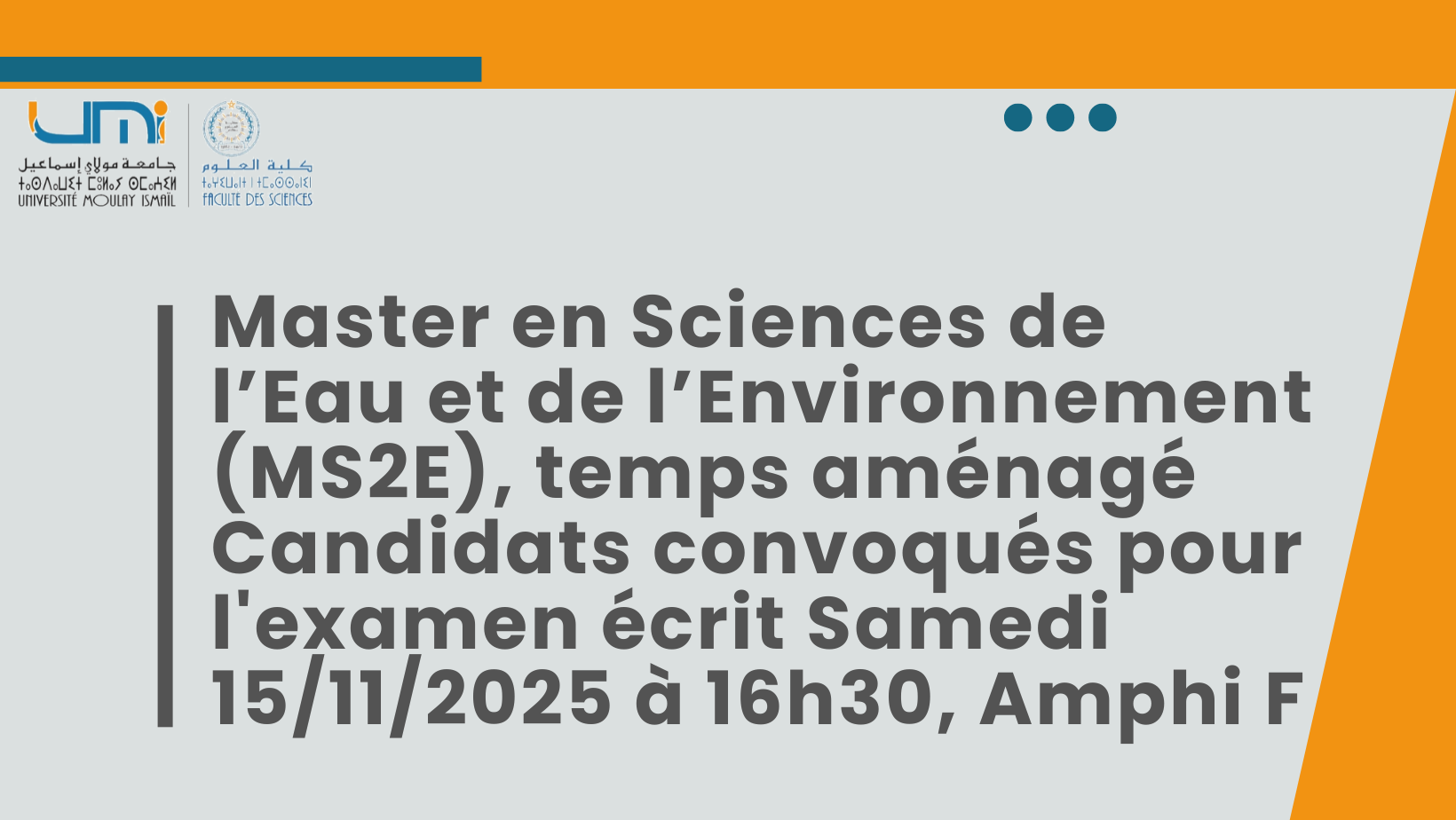 Master en Sciences de l’Eau et de l’Environnement (MS2E), temps aménagé Candidats convoqués pour l’examen écrit Samedi 15/11/2025 à 16h30, Amphi F