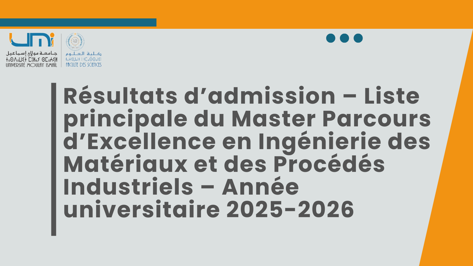 Avis: Résultats d’admission – Liste principale du Master Parcours d’Excellence en Ingénierie des Matériaux et des Procédés Industriels – Année universitaire 2025-2026