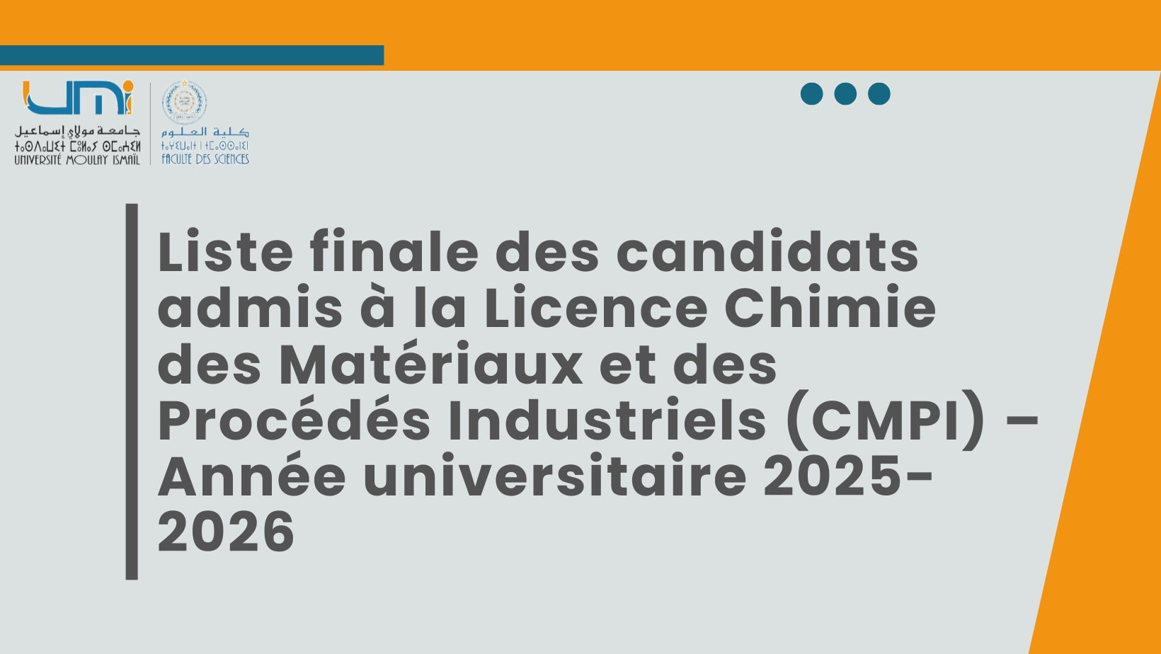 Avis :Liste finale des candidats admis à la Licence parcours d’excellence Chimie des Matériaux et des Procédés Industriels (CMPI) – Année universitaire 2025-2026