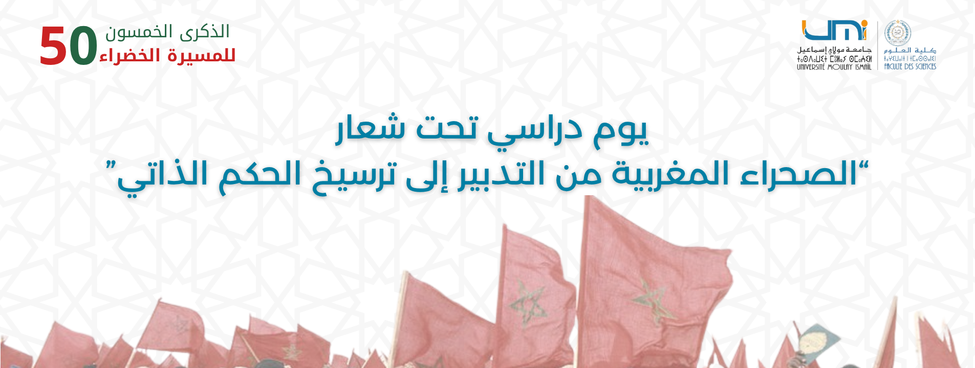 تخليداً لذكرى المسيرة الخضراء المظفرة، واحتفالاً بعيد الاستقلال المجيد وعيد الوحدة، تنظم كلية العلوم بمكناس يوماً دراسياً تحت شعار “الصحراء المغربية من التدبير إلى ترسيخ الحكم الذاتي”